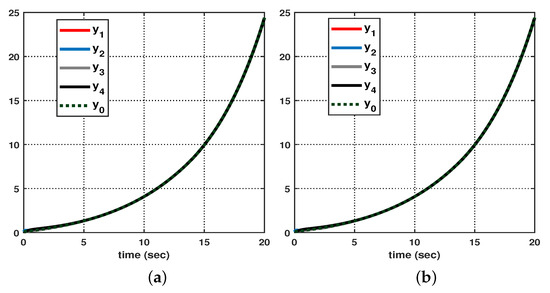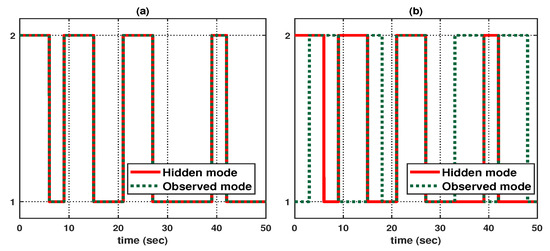 Let us consider the following initial conditions: , (), , , , and . And, as shown in Figure 8, suppose that the hidden mode (also called the system mode) and the observed mode (also called the control mode) are generated according to (44)–(46). Then, based on (47), Figure 9 shows the leader–state estimation error , where . That is, as shown in Figure 9, steadily approach as time increases, which reveals that the observer (8) with (47) can accurately estimate the leader–state regardless of the abrupt changes in the system (42). Subsequently, Figure 10a shows the leader and agent outputs for the synchronous case, which verifies that (48) achieves the cooperative output regulation of (42) since all the agent outputs (see the solid lines) follow the leader’s output (see the green-dotted line). Meanwhile, based on (49), Figure 10b shows the leader and agent outputs for the asynchronous case; this also illustrates that all agent outputs follow the leader’s output as time increases despite the emergence of the Markov switching and the asynchronous phenomenon. Eventually, from Figure 10a,b, it can be seen that the proposed method can be effectively used to realize the cooperative output regulation for (42) with hidden Markov jumps containing both synchronous and asynchronous cases.