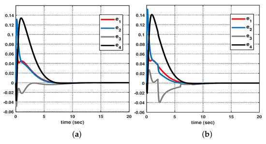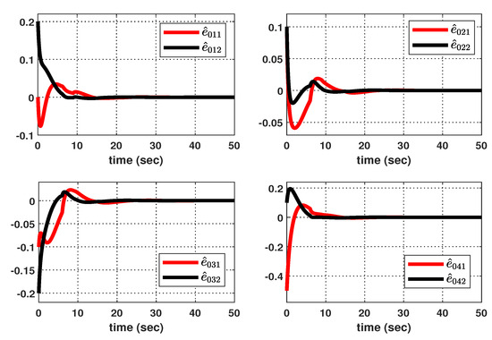 Let us consider the following initial conditions: , , , , and . As shown in Figure 3, suppose that the hidden mode (also called the system mode) and the observed mode (also called the control mode) are generated according to (36)–(38). Then, based on (39), Figure 4 shows the leader–state estimation error , where . That is, from Figure 4, it can be seen that steadily approaches as time increases, which reveals that the observer (8) with (39) can accurately estimate the leader–state despite abrupt changes in the system mode (related to the network topology mode). Next, based on (40), Figure 5a shows the leader and agent outputs for the synchronous case, which demonstrates the cooperative output regulations to ensure that all agent outputs (see the solid lines) follow the leader’s output (see the green-dotted line). Furthermore, Figure 6a shows the output error , clearly illustrating how the agent output approaches the leader’s output from the given initial conditions. Meanwhile, based on (41), Figure 5b shows the leader and agent outputs for the asynchronous case, which illustrates that all agent outputs follow the leader’s output as time increases, despite the emergence of Markov switching and the asynchronous phenomenon. Figure 6b shows that the output error steadily converges to zero as time increases; hence, it validates the results presented in Figure 5b. Eventually, from Figure 5a,b, it can be seen that the proposed method can be successfully used to achieve the cooperative output regulation for heterogeneous multi-agent systems, with hidden Markov jumps containing both synchronous and asynchronous cases.