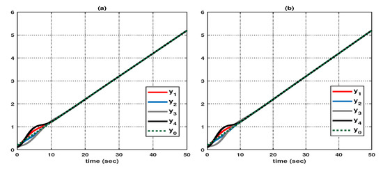 Output of leader and agents: (a) synchronous case, and (b) asynchronous case.