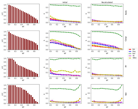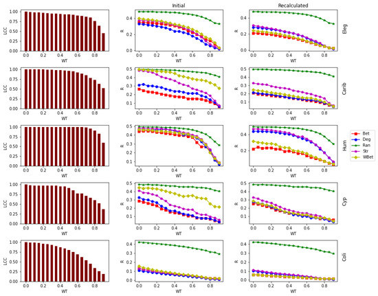 - Bellingeri, M.; Cassi, D. Robustness of weighted networks. Phys. A Stat. Mech. Its Appl. 2018, 489, 47–55. [Google Scholar] [CrossRef]