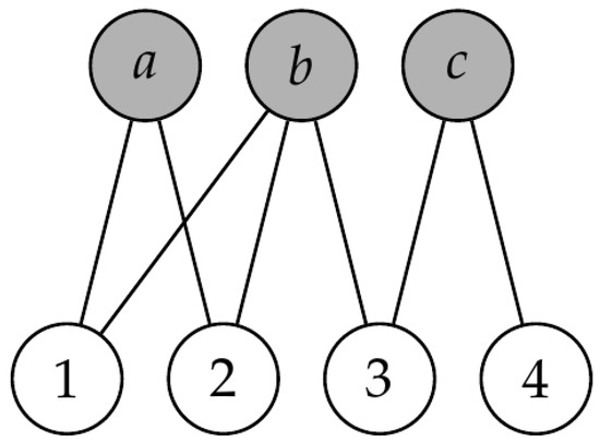 Since in a HetNet, objects are always associated with themselves and the associations between objects are always symmetric, not all description formulas describe a HetNet. In this article, we specifically stipulate the order of branches of conjunction in the description formula, i.e., the atomic formula is always on the left side of its complement, arrange the atomic formulas in the order of natural numbers according to the object indexes in them, and arrange the branches of complements of atomic formulas in the order of natural numbers and alphabetical order according to the symbols on the right of ⇒. Therefore, it is not difficult to prove that if is the description of HetNet N, is the unique description of N. Take Figure 3 as an example. Let N denote the network in it. Its description formula .
