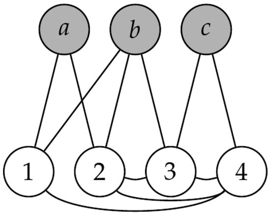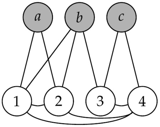 In the above definition, can be understood as one of the concept-forming operators of formal context that is isomorphic to the component general network of HetNet , and represents the objects that are associated with all objects in O. Similarly, the empty set is always homogenized since . And because R is reflexive, any single-point set with similarity is always homogenized. In particular, if a HetNet does not have any n-similar set, then it is vacuously homogenized at n. Take Figure 3 as an example. Since and , is homogenized at 2 but is not even homogenized at 1.