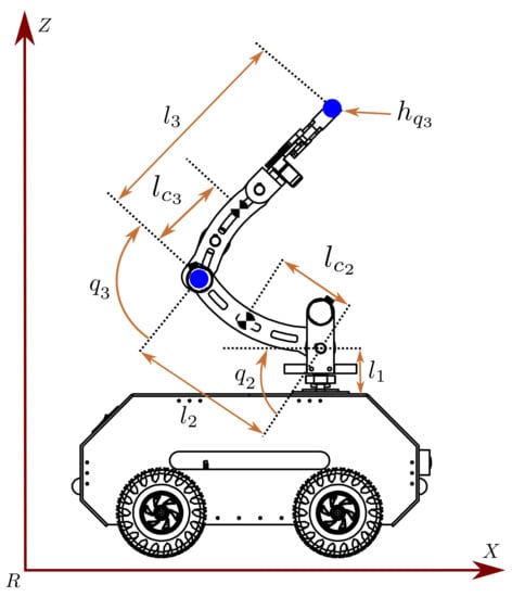 In this sense, the dynamic modeling of a mobile manipulation robotic system involves developing equations that describe the system’s motion under the influence of forces and torques. Therefore, the dynamic model of the mobile manipulator robot specifies these motions considering the action of the coupled system’s internal and external forces [].