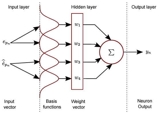 The control strategy outlined in the robust motion control approach allows for the use of a constant control gains vector. However, it is important to note that this constant selection can be dynamically adjusted or updated as required. This adjustment or update enhances the dynamical response of the mobile manipulation robotic system. In this context, the artificial neural networks enter as intelligent entities exhibiting artificial cognition and learning capabilities. Housing a vast interconnection of neurons, often depicted as simple computational or processing units in the existing literature, the artificial neural networks serve as complex conduits for processing information []. From predictive data analytics to complex adaptive systems, these computational models, drawing inspiration from the neural networks found in animal brains, demonstrate exceptional efficiency as they undertake a wide range of tasks. With their innate ability to universally approximate any continuous nonlinear multivariate function, the artificial neural networks become ideal candidates for modeling and control applications across a wide range of contexts [].