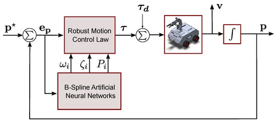 Furthermore, artificial intelligence has emerged as a transformative force in the manufacturing sector [,,], primarily through its integration with controlled advanced robotic systems [,,]. Particular emphasis is placed on applying intelligent control methods to robotic systems [,,]. Central to this approach are artificial neural networks [], which serve as a conduit between machine learning and deep learning []. Incorporating artificial neural networks into motion control of robotic systems can improve the efficiency, robustness, and adaptability of these systems, particularly in dynamic environments characterized by high complexity []. Artificial neural networks can be an excellent choice for enhancing the effectiveness of motion-control schemes for robotic systems []. Further, they offer numerous advantages, such as their ability to approximate mathematical models [], robustness against disturbances [], machine learning capabilities [], ability to handle uncertainty [], and reduced computational costs for identification and control applications []. B-Spline artificial neural networks been applied in this context and embody significant advancements in motion control of robotic systems such as aerial quadrotor robots [,,] and anthropomorphic manipulator robots []. B-Spline artificial neural networks have also been exploited to derive control techniques for different types of electric motors like induction motors [], DC shunt motors [], and switched reluctance motors []. B-Spline artificial neural networks have been incorporated in controllers of electric power systems as well []. Robust trajectory tracking control of electromagnetic suspension represents another novel application of B-Spline artificial neural networks []. Nonetheless, there is no evidence of previous direct implementation of B-Spline artificial neural networks to control mobile manipulation robotic systems with high-precision motion-planning–trajectory-tracking requirements under substantially disturbed scenarios.