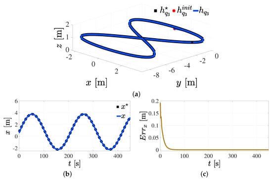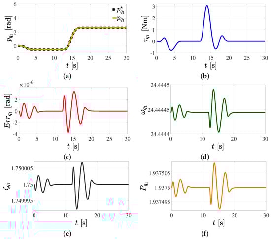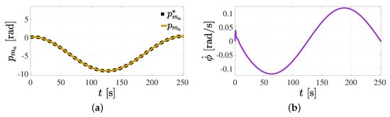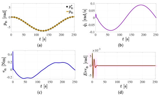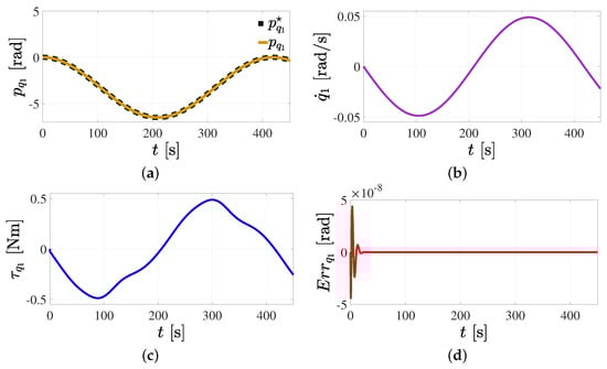 Moreover, is used like an auxiliary or alternatively named virtual control input vector to actively suppress uncertain polynomial disturbances. The present work exploits the integral reconstruction approach of velocity state variables introduced in [] as well. This approach eliminates the need for velocity signal measurements and reduces the reliance on disturbed nonlinear dynamic system models. Differentiation of generalized coordinates with respect to time is avoided in this fashion, preventing the potential generation of unwanted noise during the processing of measurement signals. From Equation (19), an integral reconstructor for the velocity vector of the reference trajectory tracking error is then derived as