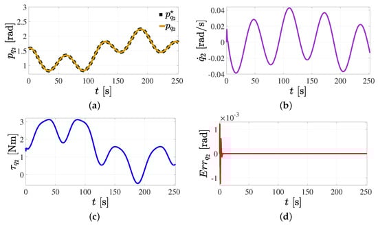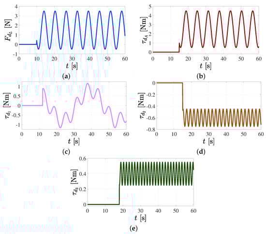 In Equation (15), represents the inertia matrix, which captures the system’s resistance to changes in motion; accounts for the Coriolis and centripetal forces matrix, which arises due to the system’s motion and its velocity; is the torque vector caused by gravity; corresponds to the control input vector, which encompasses the applied torques or forces to the system; and represents the external load torque, which accounts for any additional torques acting on the system due to external factors.