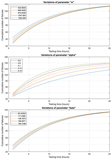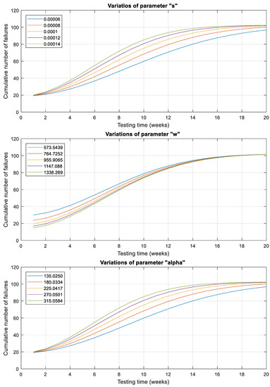 Figure 7 demonstrates that variations in parameter “s” has no impact on the value of the NEW1 model, reaffirming its stability. Changes in parameters “w” and “β” do not result in noticeable modifications to the model’s output. However, the slight parameter variations in “α” lead to slight model value fluctuations. Overall, the sensitivity analyses highlight the significance of the predicted number of initial defects (parameter “a”) in driving the behavior of the NEW1 model. Parameters “w”, “s”, and “β” are considered stable and robust, while parameter “α” exhibit relatively minor effects on the model’s output.