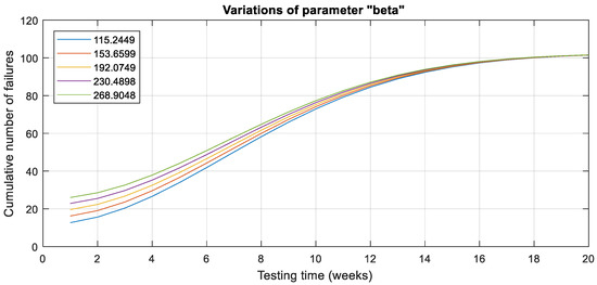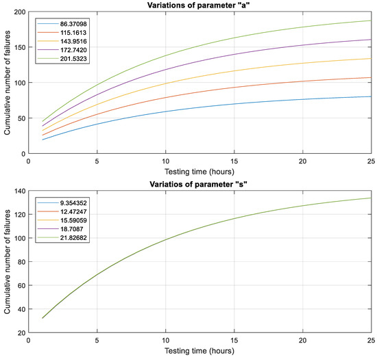 In Figure 6, Figure 7 and Figure 8, we present the results of a sensitivity analysis performed on all five parameters of the NEW1 model, utilizing DS1-DS3 datasets. These figures display the mean value function, m(t), for the NEW1 model. Within each figure, we vary one parameter value, as represented in the corresponding plots, while keeping the remaining parameters fixed, following the details in Table 3, Table 5 and Table 7. These figures provide insights into the impact of parameter variations on the cumulative number of expected faults. It is evident from Figure 6, Figure 7 and Figure 8 that among all parameters of the NEW1 model, the predicted number of initial defects, represented by the parameter “a”, plays a critical role in driving the behavior of the proposed model. Parameter changes “a” result in noticeable variations in the model’s output for all datasets.