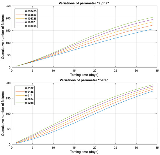 To assess the sensitivity and stability of the NEW1 model, we conducted a one-way sensitivity analysis by modifying a single parameter while keeping all other parameters fixed. This analysis aimed to identify which model parameters are sensitive to changes and which are more stable. Specifically, we examined how variations in the estimated parameter values obtained from Table 3, Table 5 and Table 7, ranging from −40% to +40% at 20% intervals, affect the estimated mean value function of the NEW1 model.