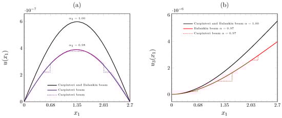 - The flexural rigidity is affected by the geometry and fractal topology of the beam, such that when increases, decreases. However, Carpinteri’s beam is stiffer than Balankin’s beam, as shown in Figure 4a,c.