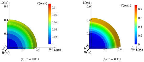 Figure 15 shows the process of unhindered axisymmetric tall cylinder () collapse from the front (Figure 15a–d) and top views (Figure 15e–h). Firstly, only particles on the fracture surface flow at the beginning and the surface of the cylinder has the maximum velocity, as shown in Figure 15a,e. When the flow continues, the top of this dynamic interface goes up on the left boundary (Figure 15b–d,f–h) and less material upon the surface flows until it coincides with the free surface. For this collapse, the top of this dynamic interface moves on the left symmetrical axis in the entire flow process, which is similar to the conclusion of in 2D situations. Thus, the final deposit height is inconsistent with the initial height for tall cylinders.