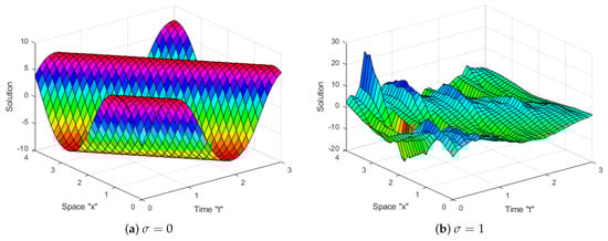 Now, we can notice from Figure 1, Figure 2, Figure 3, Figure 4, Figure 5 and Figure 6 that when the multiplicative noise is ignored (i.e., when ), there are many other types of solutions, such as periodic solutions, kink solutions, and so on. After short transit patterns, the surface becomes flatter when noise is incorporated, and its amplitude is increased by . This demonstrates that SWP plays a significant role in shaping the behavior of the exact solutions of CSKdV equations and keeps them stable around zero, preventing the generation of rogue waves.