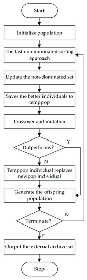 The elite strategy and variation strategy are combined in this study using the following methodology: since the solutions consist of multiple targets, dominance rank is used as the fitness allocation scheme. Before each evolution, the population’s good solutions that satisfy the evolutionary conditions are stored separately in the elite pool. By determining the size of the dominance rank, it is decided which is better, the parent or the children; if the evolved children outperform their parent, the parent is removed, and the offspring is then stored in the new population. If not, the parent is retained in the new population and the offspring is discarded.