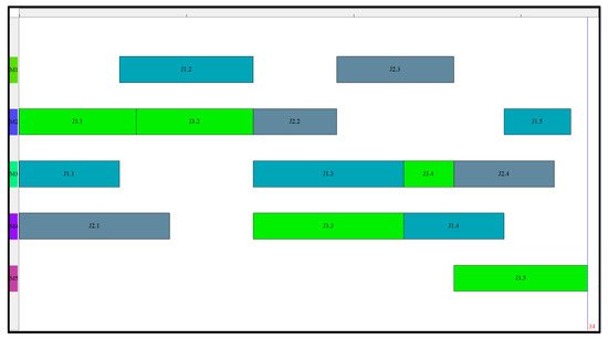 The fourth layer is in charge of sequential decoding. Using the decoding information from the first three layers, the active scheduling decoding method is used to create the final decoded Gantt chart shown in Figure 3.