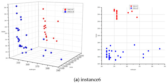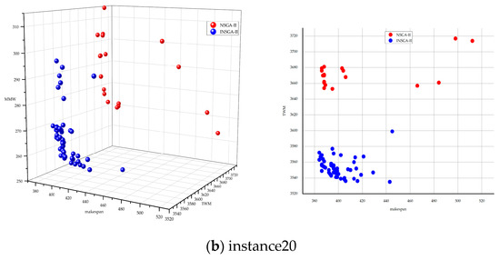 In order to compare the optimization of the two algorithms in 24 instances, all the Pareto solution sets acquired by the two methods are combined, and Table 4 shows the number of non-dominated solutions in the combined solution set. To clearly show the value of the suggested method, the results of the two methods in instances 6 and 20 are displayed in Figure 5. It can be seen that the outcomes produced by INSGA-II are better than those produced by NSGA-II.