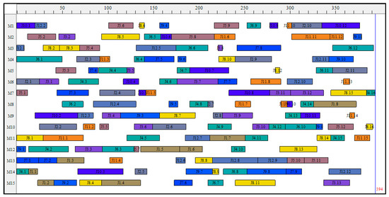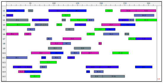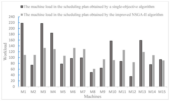 Finally, an illustration is provided to show how it is critical to take several needs into account in a practical production setting. Figure 7 shows the Gantt chart for instance 5, which solely takes into account the makespan. The Gantt chart produced by the INSGA-II algorithm is preferable, even though the two schedules have the same total completion time (318), when the two metrics, maximum machine workload and total machine workload, are compared. Figure 8 displays the workloads on each machine in both Gantt charts. It is obvious that each machine has a more uniform workload in the scheduling scheme produced by the INSGA-II algorithm when several goals are taken into account. The maximum and minimum machine workloads for the scheduling scheme considering three targets are 129 and 61, respectively, in comparison to the scheduling scheme considering only one target. This shows that the latter workload is more evenly distributed across machines, which is significant for extending the machine’s life. The suggested technique also lowers the maximum machine workload by moving unnecessary operations to more practical computers. The scheduling schemes with single objective values of 1687 and multiple objective values of 1645 for the total machine workload index, respectively, show that the proposed algorithm also optimizes the total machine workload.