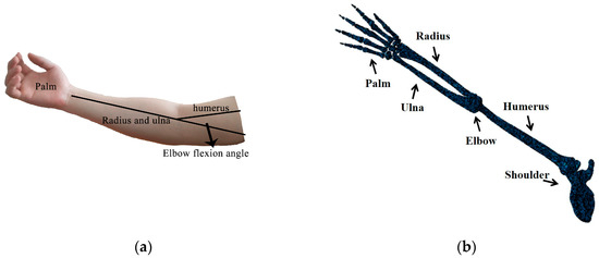 Schematic and skeletal view of the arm: (a) Diagram of the arm; (b) Arm bones.