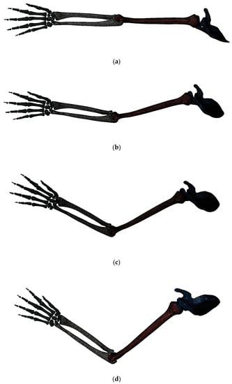 The ulna’s principal stress distribution is from the wrist to the elbow joint, as shown in Figure 10.