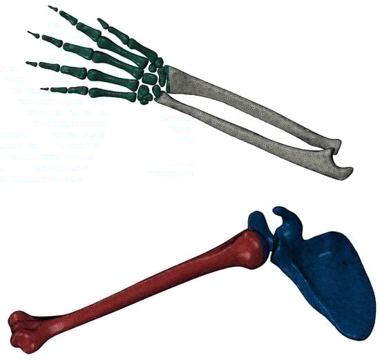 This model is discretized using the 10-node second-order tetrahedral element (C3D10). This model includes the palm bone, radius, ulna, humerus, and scapula, where the radius/ulnar elements/nodes are 32,355/52,276 and 35,720/57,487, respectively. The finite element meshing is shown in Figure 3. This model mesh has three displacements per node (three degrees of freedom).