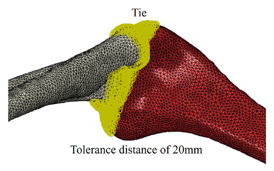 The scapula and metacarpal are set as rigid bodies, fixed in the normal human anatomical position. At the proximal part of the scapula, the translational displacements in the x, y, and z directions are constrained; at the metacarpal bone, only the displacements in the direction of the applied concentrated force are unrestricted, while the translational and rotational displacements in the other directions are restricted. The elbow joint connects the humerus, radius, and ulna, where the human body can flexibly achieve both flexion and internal and external rotation. The forces at the elbow joint are complex, so to simplify the calculation, a Tie-binding constraint is set between the humerus, radius, and ulna at the elbow joint, with a specified tolerance distance of 20 mm so that the contact surfaces of the humerus and the radius-ulna are firmly bonded together and do not separate during the force (Figure 4).