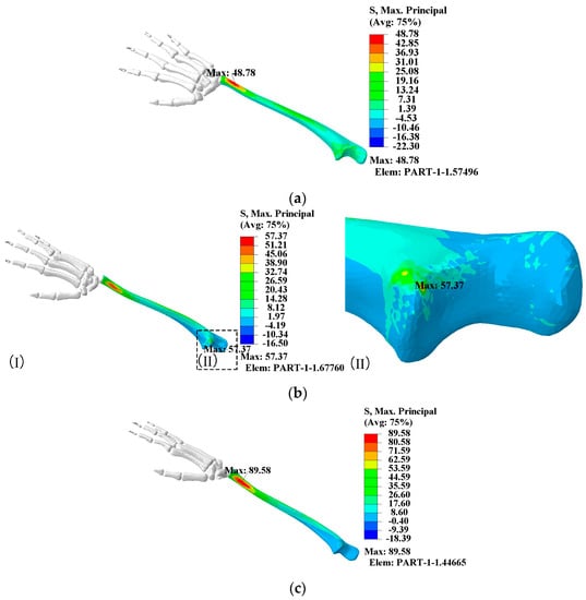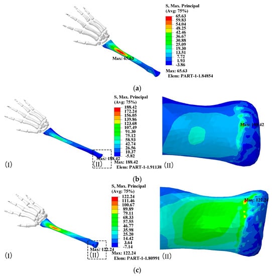 The numerical results of the maximum principal stress of the ulna are shown in Figure 8.