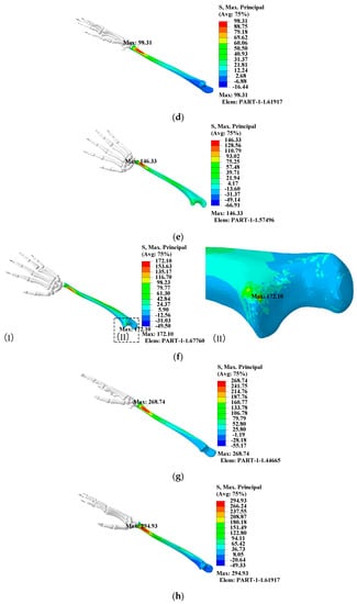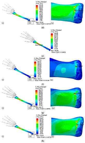 In Figure 8a, the maximum principal stress can be seen on the compressed side of the dorsum of the hand. This stress is concentrated at 1/10th on the proximal ulnar side. The transfer of the principal compressive stress occurs along the palmar side of the hand with a wide range of axial transfer. Additionally, the principal stress is locally rising near the elbow joint and distributed around the ulnar joint. As the elbow flexion angle increases, the principal stress steadily rises from 48.78 MPa to 98.31 MPa. Figure 8b shows that the principal stress concentration distribution region rotates towards the ulnar side. The region of principal stress concentration remains at the ulnar 1/10th, with the highest principal stress located in the elbow joint and with a value of 57.37 MPa. Furthermore, it is noticeable that the maximum principal stress is concentrated at the elbow in the form of a point (Figure 8b-(II)). As the flexion angle from 60°to 80° (Figure 8c,d), the principal stress concentration shifts from the dorsal side of the hand to the ulnar side. However, the location of the maximum principal stress in the axial direction remains unchanged. Comparing Figure 8e–h, the rise in principal stresses is directly linked to the growth in load operating on the hand. Similar to the radius, the distribution of principal stress remained unchanged despite the 300 N hitting force.