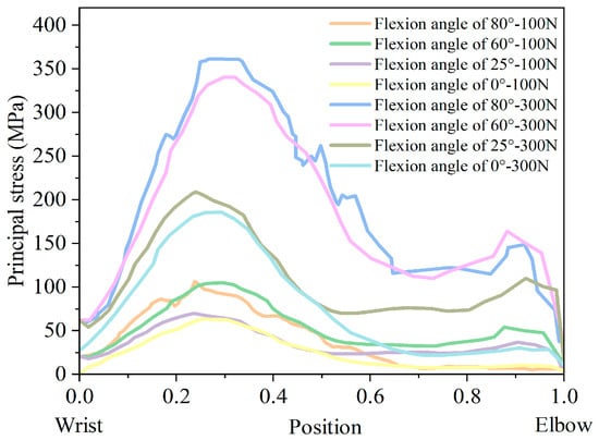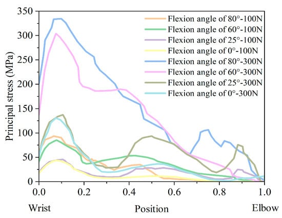 In Figure 7, the radial principal stress is focused on approximately one-third of the radius when subjected to a hitting force. Additionally, the distribution of principal stresses is similar between 0° and 25° of elbow flexion near the elbow joint. However, when the elbow flexion is 25°, the principal stress increases slightly. For elbow flexion in the 60–80° range, the distribution of principal stress was similar, and the maximum values substantially increased. The principal stress distribution does not change for 300 N: the larger the flexion angle, the larger the principal stress value.