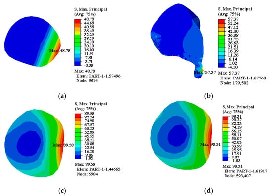 Compared to hitting force at 100 N, 300 N shows essentially the same maximum principal stress distribution, with the principal stress becoming about three times larger than before, so the value of the force does not change the principal stress distribution (Figure 5e–h).