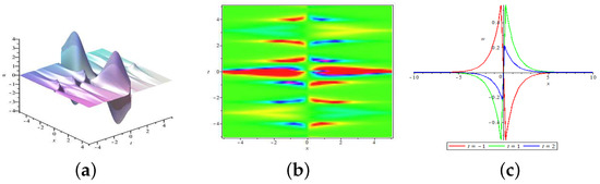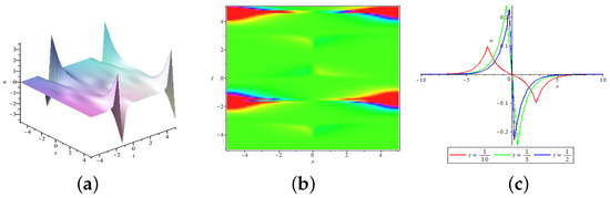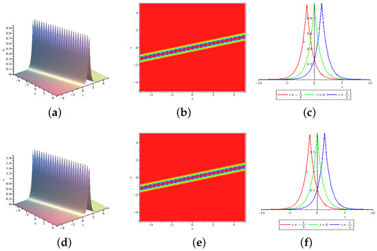 The single peakon solution Equation (6) is depicted in Figure 1. In the meantime, it can be seen that the amplitudes of are determined by the wave speed ; see Figure 1c,f.
