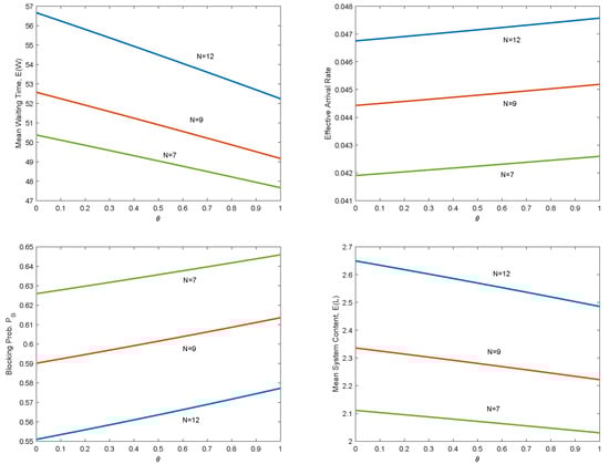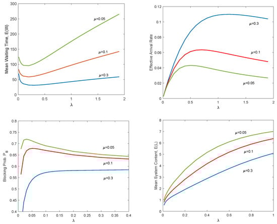 Figure 2 and Figure 3 depict the corresponding numerical results of the main performance measures. We plot the mean waiting time , effective arrival rate , blocking probability and mean system content against parameter and with three different values of and 0.05 and . Each figure contains three curves with different colors to simultaneously describe the changes of each indicator with parameters.
