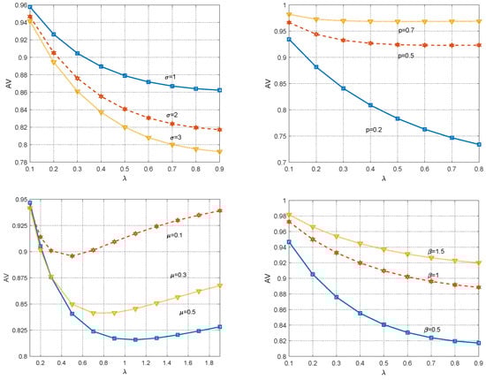 Numerical examples related to the impact on main reliability indicators and performance measures are presented in this section. All numerical results are obtained by programming using the software MATLAB (R2017b) according to the formulas in Proposition 1, Proposition 2, and Section 4 and Section 5. By analyzing these figures, some important conclusions about the characteristics of the system have also been summarized, which allow us to have a deeper understanding of the proposed model. It is worth mentioning that we did not analyze the impact of every parameter on all performance indicators, which would make the content too cumbersome. On the contrary, based on the preliminary analysis of each indicator, we selected a few of the most concerned indicators and the corresponding numerical conclusions are given in Figure 2, Figure 3, Figure 4, Figure 5 and Figure 6.