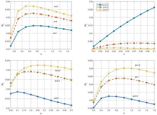 More specifically, we selected eight performance measures (, , , , , , , and ) out of 11 performance measures, and , and are not in consideration. For reliability and availability indices, we selected three (, , and ) out of four indices to conduct numerical studies, and is not in consideration. Some metrics reflect similar system performance, such as (the expected number of packets in the system) and (the expected number of packets in the orbit). And with the help of the relationship equation between the two in Section 4, it can be seen that their trends with parameters are similar, so we choose only one of them to study and analyze. The other indices are selected based on a similar thought.