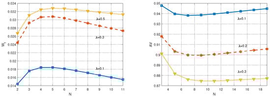 The numerical results of the effect of the number of finite sources on the indicators and are summarized in Figure 6. This figure depicts the property that as a function of the number of finite sources N, has a maximum value, while has a minimum value. This conclusion is clearly not in line with our expectations. As seen in the figure, the maximum value of increases with the arrival rate, while the minimum value of decreases with the arrival rate. This inspires us that we can effectively control the extremes of and AV by controlling the arrival rate of the packets.