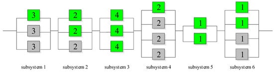 Solution encoding in the GA used is a 3 × s matrix, in which s represents the number of the subsystems in the system. For each subsystem, the first row is the type of selected component and the second and third rows give the numbers of allocated active and standby components, respectively. There is no need to add a row for the redundancy strategy, as it may be determined using the second and third rows: if the number of standby components is equal to zero, then the redundancy strategy is active (or no redundancy strategy, in case the number of active components is equal to one); if the number of active components is equal to one and there are some standby components, then the redundancy strategy is standby; finally, if the number of active components is larger than one and there are also some standby components, then the redundancy strategy is mixed. Figure 2 shows an example for the solution encoding with s = 6 subsystems. In the Figure, the active components are shown in green and the standby ones are shown in grey. As it can be seen in the Figure, the redundancy strategy for subsystems 1 and 4 is standby, that for subsystems 2 and 6 is mixed, and that for subsystems 3 and 5 is active. Figure 3 represents the structure of the system.