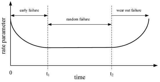The rate parameter of the Erlang distribution is assumed to be in the form of a bathtub curve [70,71,72,73,74], as shown in Figure 4. As can be seen, the rate parameter first decreases over time, representing infant mortality, i.e., the process for which defective items fail early and the occurrence rate of the shocks decreases over time as the defective items are weeded out of the population. Then, the rate parameter remains constant for a period of time, as fully random shocks are the cause of failure, independent of time. Finally, the rate parameter increases, due to the aging process, for which the components are more likely to fail as time goes on.