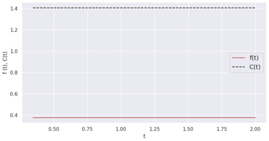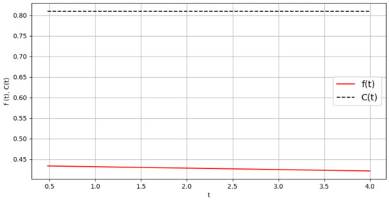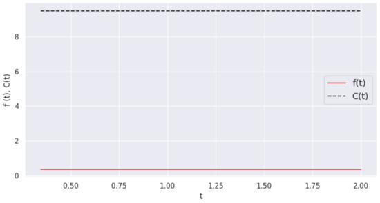 It should be noted that both methods give consistent results for the equilibrium arrival strategy for a three-player game with retrials. In contrast to the case of two players, now the equilibrium pdf is not a constant and decreases in the interval . Moreover, just as in the case of two players, where it was easy to obtain analytical solutions, in the case of three players, the strategies found numerically agree with the results of calculations in the paper [7], where another objective function was considered for the same system.