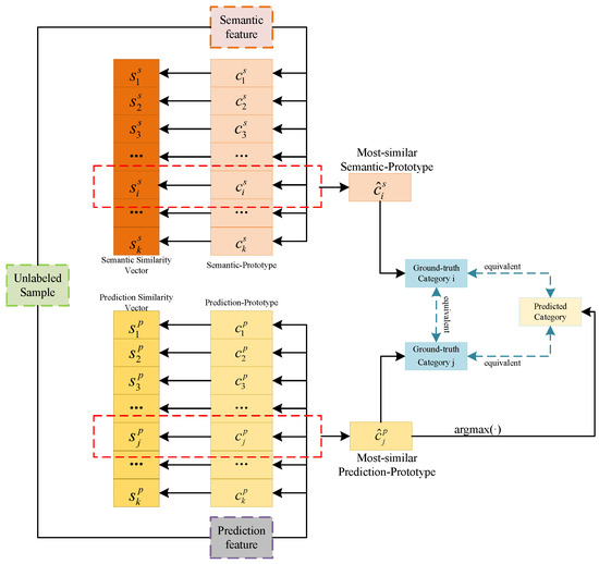 where is the cross-entropy, is a filter function, is the most similar prediction-prototype, returns the category having a maximum prediction probability, and is the prediction of the unlabeled sample with strong augmentation, i.e., . Equation (4) is the core of our approach, which highlights the prototype consistency criterion and the method to construct the loss function based on this criterion. Equation (4) demonstrates that the most similar prediction-prototype can be considered as a pseudo-label only if the following condition is true: the category of the most similar semantic-prototype (i.e., i), the category of the most similar prediction-prototype (i.e., j), and the predicted category of the most similar prediction-prototype (i.e., ) are equivalent. This condition includes two aspects of constraints: (1) indicates that the features regarding with the unlabeled samples and the prototypes regarding the labeled samples are supported to be consistent both on the semantic and prediction space, ensuring the reliability for the pseudo-labeling process. (2) indicates that the ground-truth category and the predicted category of the prediction-prototype should be consistent, guaranteeing the accuracy of the pseudo-label. The details are shown in Figure 3.