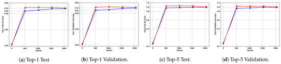 The variation trends of the Top-1 and Top-5 accuracy rates. We show the trends on the test and validation set. Note that the red line represents ProMatch and the blue line represents ProMatch without PC Loss.