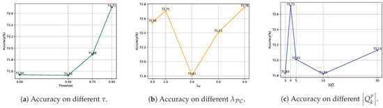 - The first row and 7th–9th row of Table 5 show the accuracy rates of our proposal ProMatch under different values of the confidence threshold . We also plot these results in Figure 7a. From these results, we can observe that the accuracy rates of our method have a positive correlation with the confidence threshold. Specifically, ProMatch achieves the optimal accuracy rate of 72.71% at the confidence threshold .