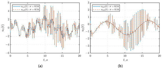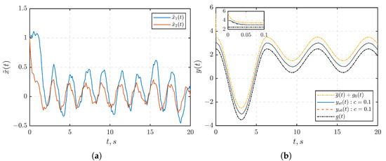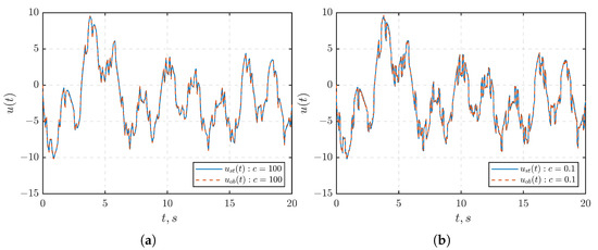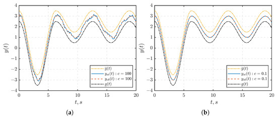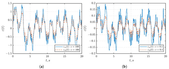 Furthermore, as depicted in Figure 3, the signal is stabilized within predefined ball regions. Specifically, at (Figure 3a), is stabilized within a ball with a radius (approximately ), whereas at (Figure 3b), it is stabilized within a ball with a radius (approximately ). Upon comparing Figure 2a,b, as well as Figure 3a,b, it is important to highlight that decreasing the value of the parameter c leads to enhanced suppression of disturbance effects.