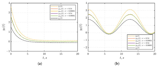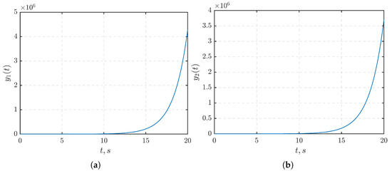 is defined as shown in Section 7.1. The given system is unstable since the matrix A is non-Hurwitz. Figure 6 illustrates the step response of the open-loop system, demonstrating that the output signals (Figure 6a) and (Figure 6b) go to infinity as time increases.