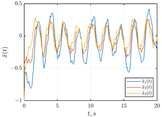 It can be seen that the parameter c in (16) is associated with the radius of the open ball in which the trajectories of the system (11) are attracted (the radius of the ball is equal to ). If we decrease the value of c, then the radius of the ball will decrease and, in turn, the limiting value of . Therefore, with a decrease in the limiting value of , the oscillation of the variable also decreases in the set , which is caused by the influence of the external disturbance .