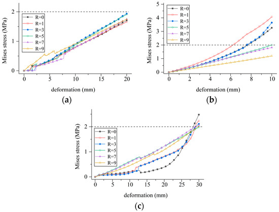 - During compressive deformation, the overall deformation stress decreases with an increase in the aperture size (though stress concentration may occur when 0 < R ≤ 3). However, when the aperture size is less than 5 mm, the deformation stress of the waterstop exceeds the critical stress value.