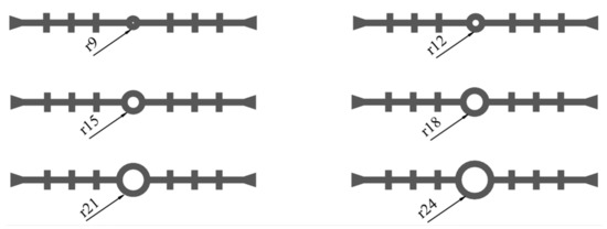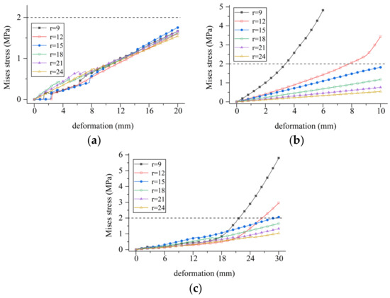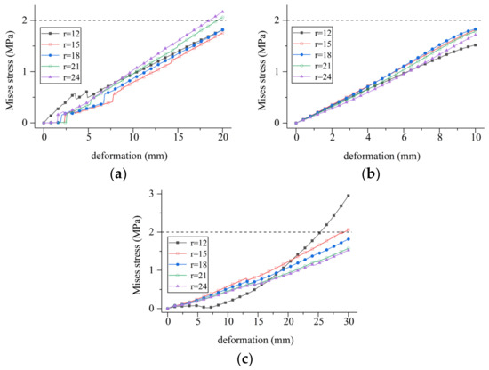 - During compression deformation, the deformation stress decreases with an increase in the aperture size. When the aperture outer diameter r ≥ 15 mm, the deformation stress is below the critical stress value (at r = 9 mm, the deformation stress is excessively high, and the complete curve is not shown in the graph).
