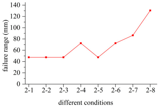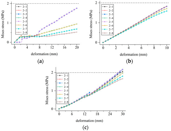 - Under tensile deformation, the stress values in all conditions are below the critical stress. Conditions 2-1, 2-2, 2-3, and 2-5 exhibit nearly identical deformation stresses, while conditions 2-4 and 2-6 also exhibit similar deformation stresses. The common factor among these pairs of waterstops with similar deformation stresses is that the position of the first waterstop rib on both sides is the same, with the difference being the number of ribs or the positions of the remaining ribs. Furthermore, conditions 2-5, 2-6, 2-7, and 2-8 demonstrate that as the distance between the first rib on both sides and the waterstop orifice increases, the tensile deformation stress of the waterstop decreases continuously. The difference between the maximum and minimum tensile deformation stresses can reach 233.5%.