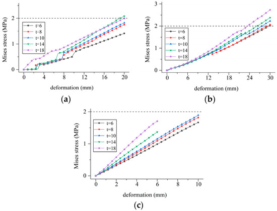 - During compression deformation, when the flange thickness is greater than or equal to 14 mm, the compression deformation leads to tensile damage in the concrete lining (only partial curves are shown for the cases of t = 14 mm and t = 18 mm). The damage is due to the fact that when the other parameters of the waterstop belt remain unchanged and the thickness of the wing plate increases, the outer contour of the hole in the waterstop belt decreases, the concrete lining joint narrows, and the compression deformation of the hole in the waterstop belt becomes increasingly intense with an increase in the thickness of the wing plate.