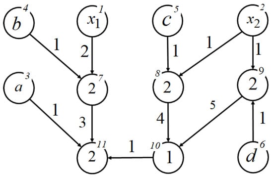 In the network operator graph, the arguments of the mathematical expression are shown in the source node. The numbers of functions with two arguments are shown in other nodes. Numbers of functions with one argument are displayed next to the edges. The nodes are indexed in their upper parts. If the node indices are sorted such that the index of node where the edge comes out is of a lesser value than that of the index of nodes where the edge comes in, then the network operator matrix is upper triangular.