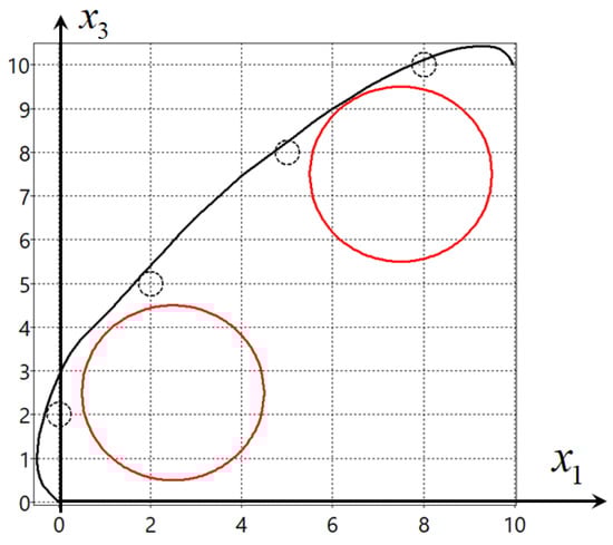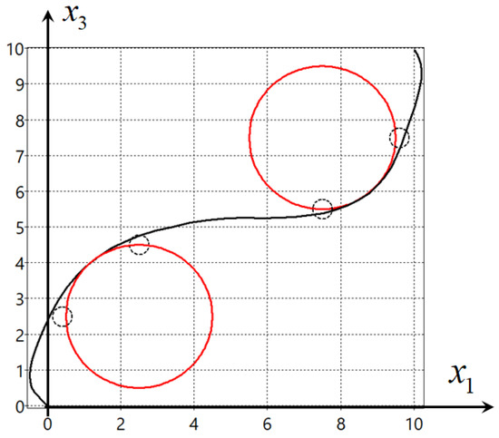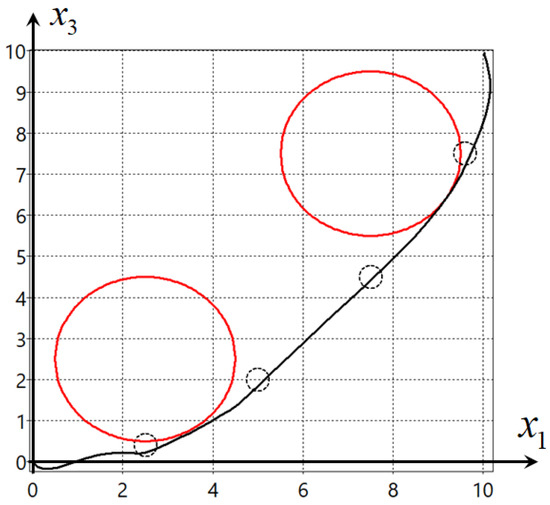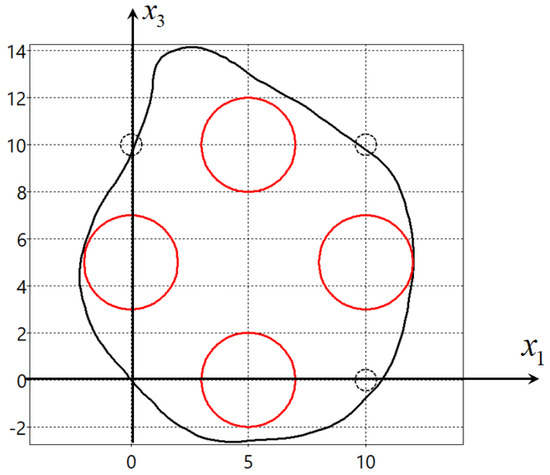 where M is the number of obstacles, , is the radius of obstacle i, , , are coordinates of their centers, , , , , , , , .
