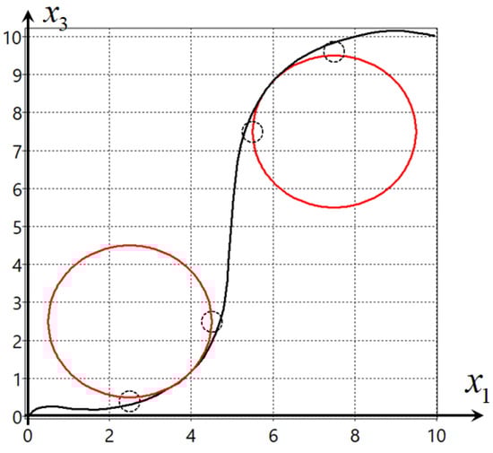 The projections of optimal trajectories on the horizontal plane of the four optimal control problems are shown in Figure 2, Figure 3, Figure 4 and Figure 5. In the figures, red circles indicate obstacles that define phase constraints of the problem. Small dotted circles indicate the specified areas mandatory for trajectories to follow.